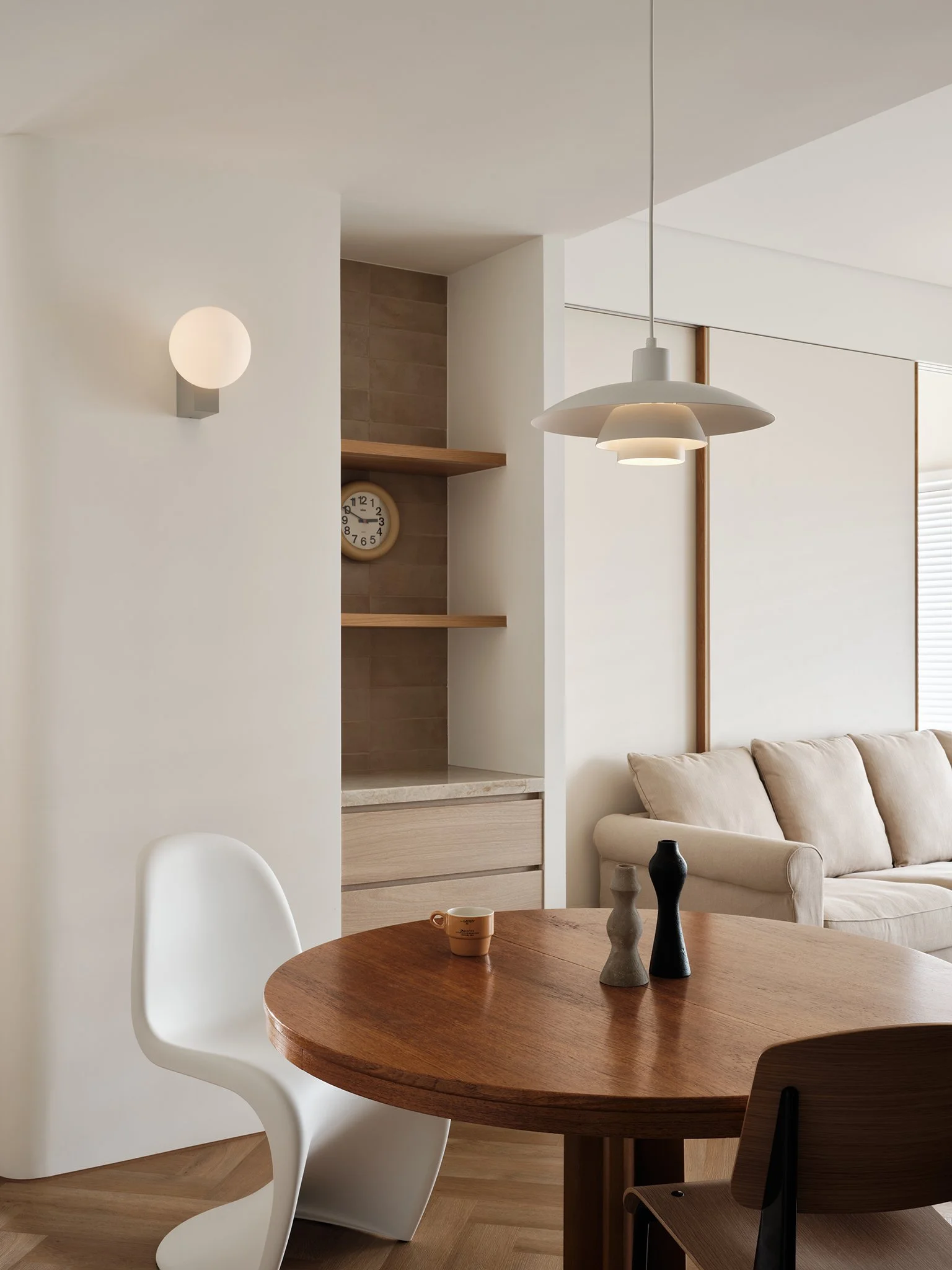 天花板高度由餐廳向客廳漸升,視覺延伸至北向開窗,迎向陽明山景,使空間顯得更開闊。餐廳天花板下壓,正好容納吊隱式設備。電視牆略為突出,是為了滿足主臥更衣間需求,同時界定玄關與餐廳的過渡。主臥前的短廊則巧妙暗示私領域的轉換。電視牆的圓角語彙延伸至白色立面上的弧與拱,營造溫潤輕快的節奏。素色立面提供高度包容性,襯托人字拼木地板、木格柵門與個性家具,形成協調的共融畫面。