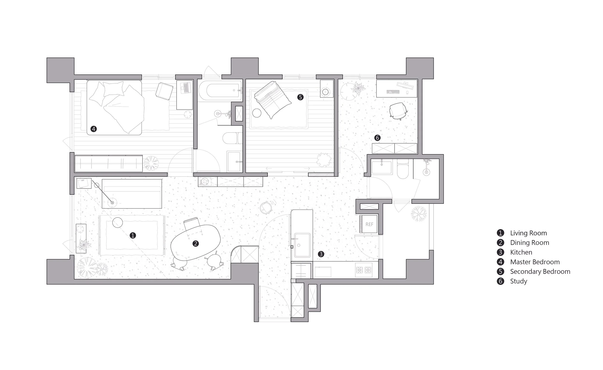 屋主夫妻皆具設計背景,搬入此空間一年後,對自身的生活習慣、既有家具單品與室內光線變化有了更深刻的理解。由於空間有著雙面採光,且原先封閉的廚房陰暗狹窄,建築師遂打開原本侷限的邊界,使之與客廳、餐廳貫連,形成開放且流動的共享場域。